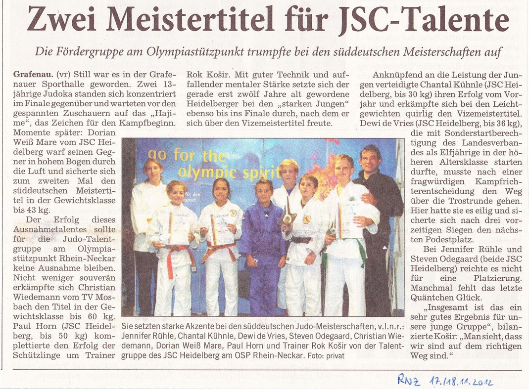 Der Erfolg des Ausnahmetalents sollte für die Judo Talentgruppe am Olympiastützpunkt Rhein-Neckar am vergangenen Wochenende keine Ausnahme bleiben. Nicht weniger souverän erkämpfte sich Christian Wiedemann (TV Mosbach) den Titel in der Gewichtsklasse -60 Kg. Paul Horn (JSC Heidelberg, – 50 Kg.) komplettierte den Erfolg der Schützlinge um Trainer Rok Kosir. Mit guter Technik und auffallend mentaler Stärke setzte sich der gerade erst zwölf Jahre alt gewordene Heidelberger bei den „starken Jungen“ ebenso bis ins Finale durch, wo er sich über den Vizetitel freuen konnte.